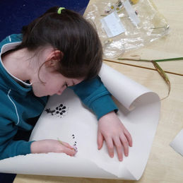 Our children were given the opportunity to explore Tanner Park on spring nature walks. The children noticed buds starting to open up on the local trees, and explosions of daisies throughout the fields. While walking in the breeze they listened out for sounds of nature and birds singing. They collected some natural materials such as twigs, cones, flowers, and leaves which they used with black paint as their tools to create patterns of nature drawings. were